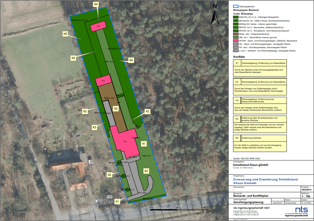 Die nts Ingenieurgesellschaft wurde von der Schießstand Ahaus gGmbH mit der Erstellung eines Landschaftspflegerischen Begleitplan (LBP) und einer Artenschutzvorprüfung (ASP I) für die Erneuerung und Erweiterung eines Schießstandes in Ahaus Ammeln beauftragt.