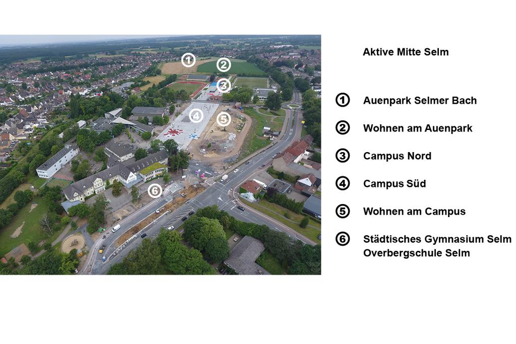 Innerhalb der Aktiven Mitte liegt zentral das Areal des Campus Selm. Durch neue Wege und Freiflächen bildet der Campusplatz den Mittelpunkt der Aktiven Mitte, in dessen Umfeld Bildungs-, Betreuungs- und Sportangebote sowie besondere Wohnformen für alle Generationen entstehen.