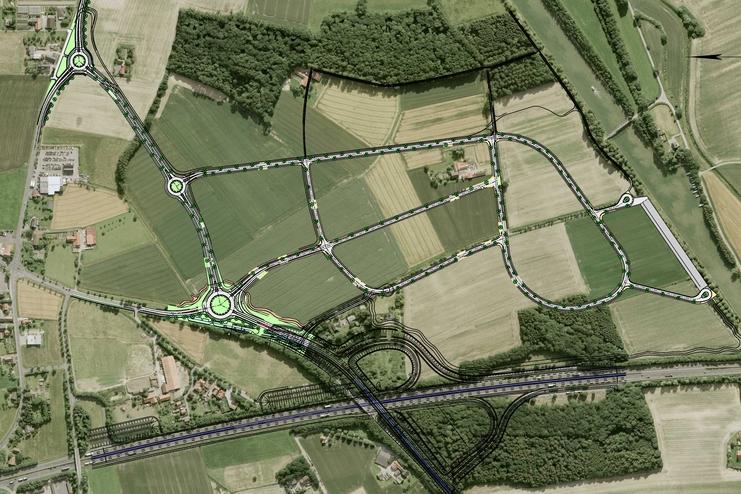 Mehrerer Kreisverkehre mit inneren und äußeren Erschließungsstraßen – (Anschluss an die Autobahn A1 / Schiffsanlegestelle am Dortmund-Ems-Kanal); Radwegplanungen; Endausbauten;
