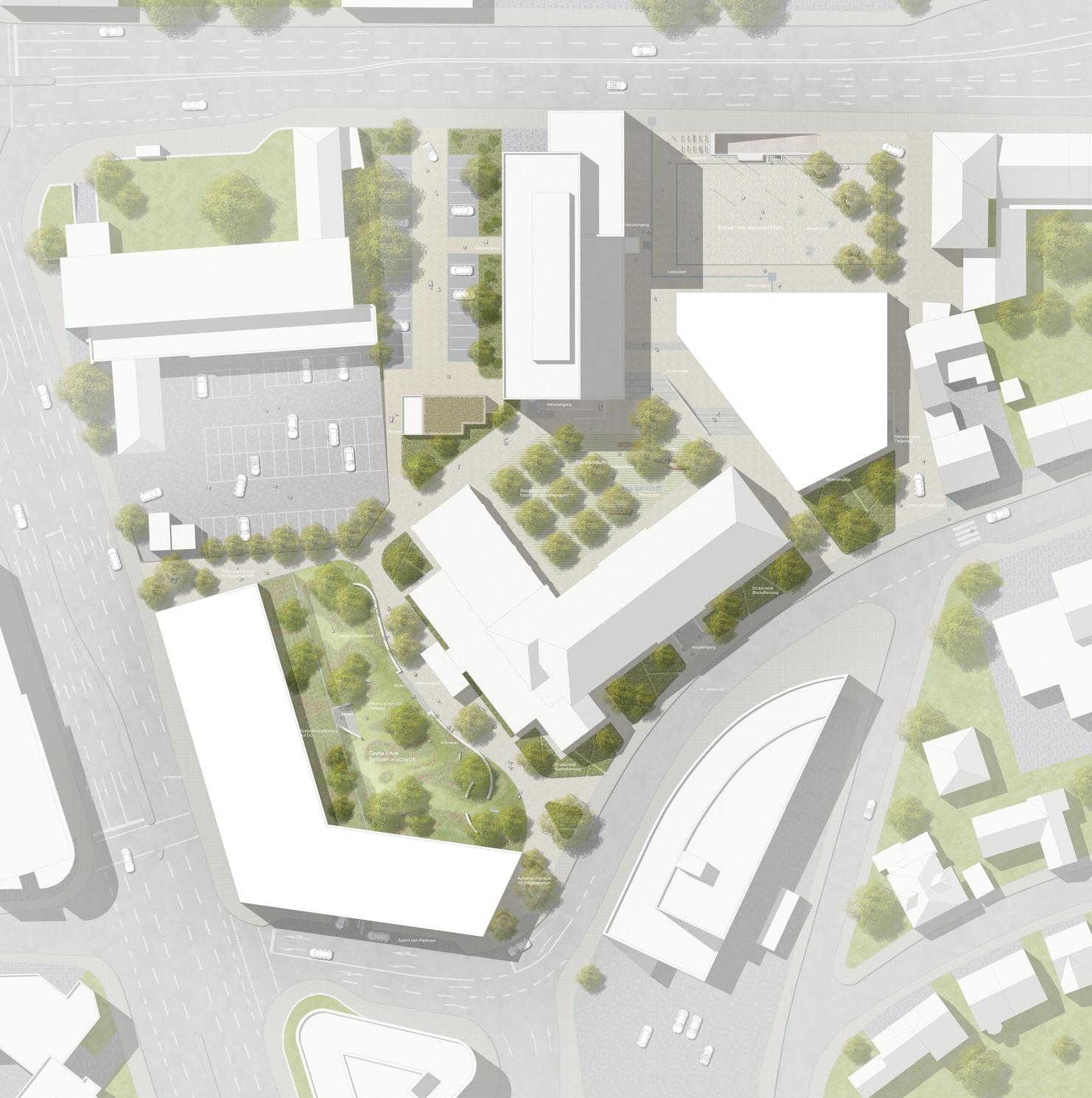 nts hat gemeinsam mit dem Architekturbüro Schoeps und Schlüter aus Münster einen anspruchsvollen Wettbewerbsbeitrag erarbeitet. Der Vorplatz des vorhandenen Kreishauses wurde als befestigte, multifunktional nutzbare Eingangsfläche erhalten und durch einen dezenten Anbau für die Verwaltung ergänzt. Die notwendigen Pkw-Stellplätze wurden in einem als zentralen Mobilitätspunkt konzipierten Parkhaus angeordnet. MIt einem Photovoltaikdach ausgestattet und einseitig in die Geländemodellierung integriert, wurde der Kompromiss zwischen Flächenbedarf für Mobilität, nachhaltiger Energieversorgung und Erhalt von innerstädtischen Grünflächen gefunden.