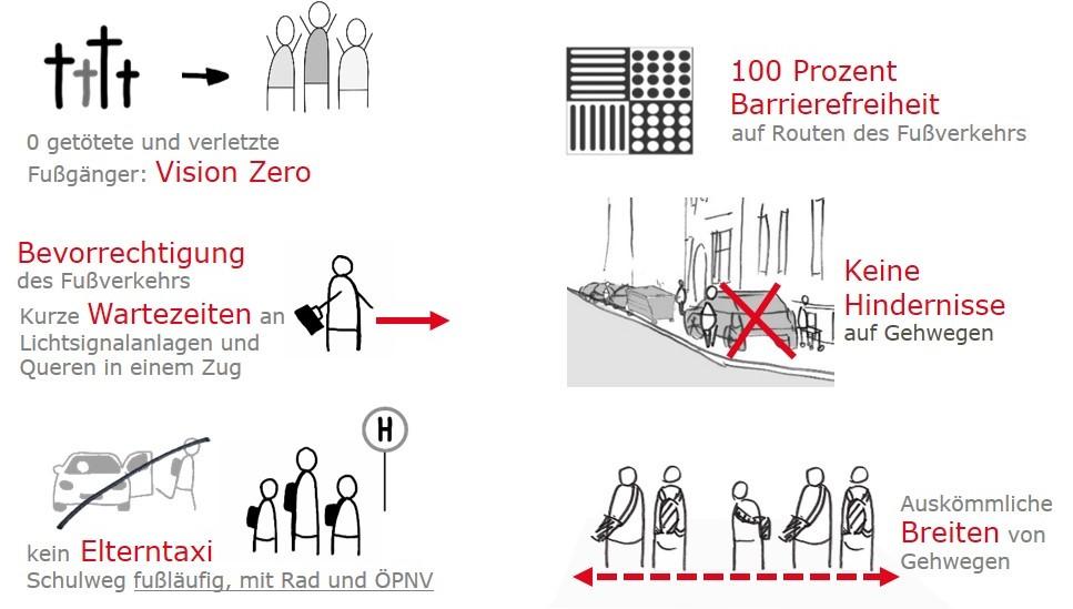 Ergebnisse des Prozesses sind unter anderem das stadtweite Fußverkehrs-Flanierkonzept mit unterschiedlichen Qualitätsanforderungen je Wegekategorie, verbindliche Ziele für die Fußverkehrsplanung und Planungsprämissen der Straßenraumgestaltung, die leistungsfähige, sichere und nachhaltige Stadtstrukturen fördern.